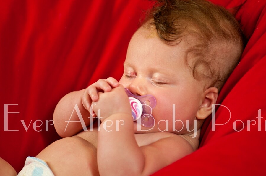 Four month old girl napping away with her pacifier.