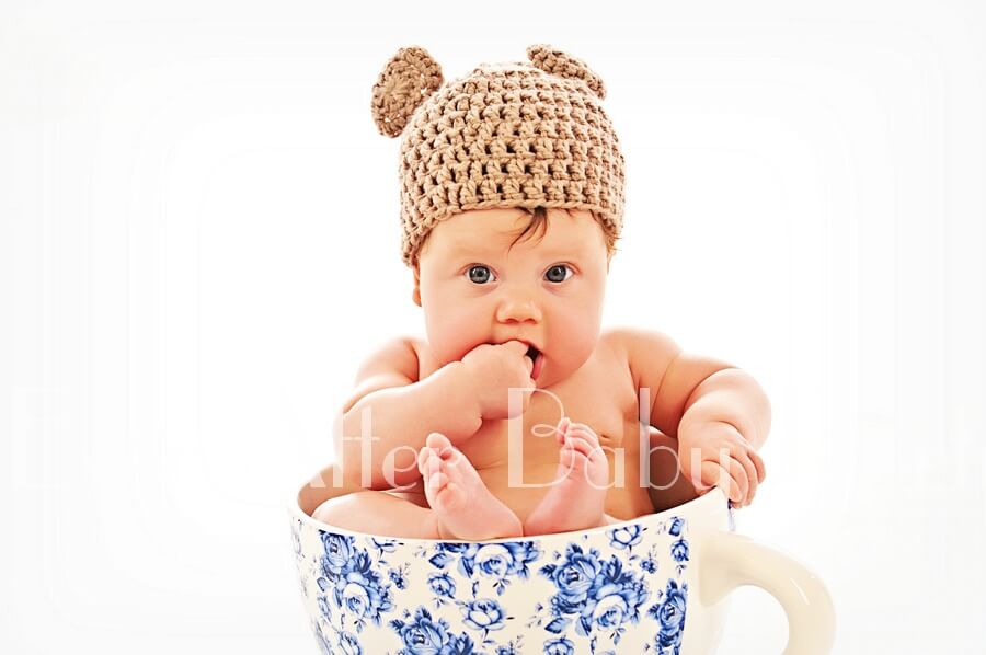 Time for tea! Baby Sam is so cute with her bear hat posing in a teacup!