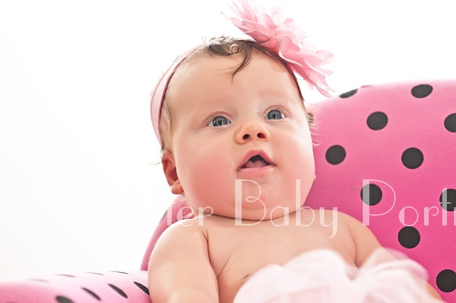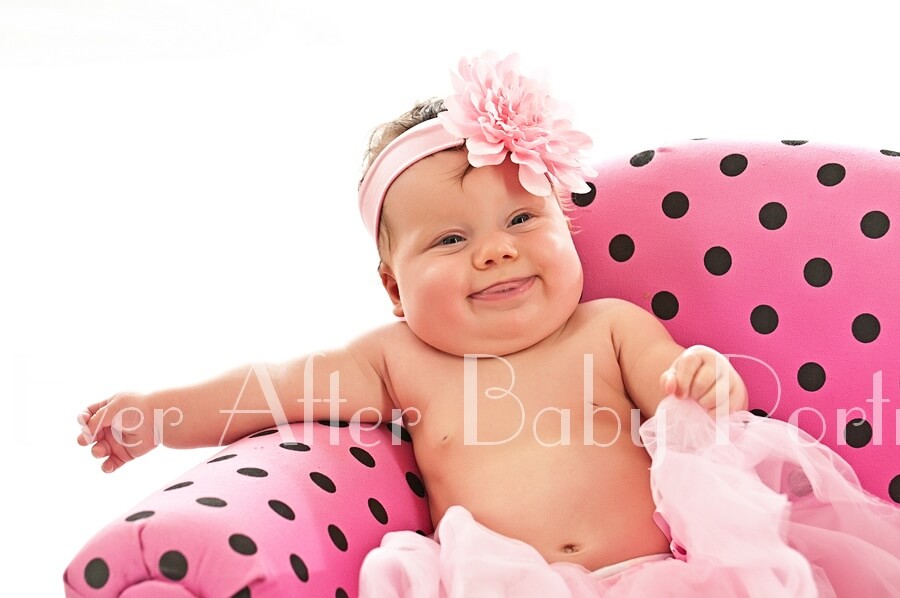 Smiling four month old in pink tutu in polka dot chair.