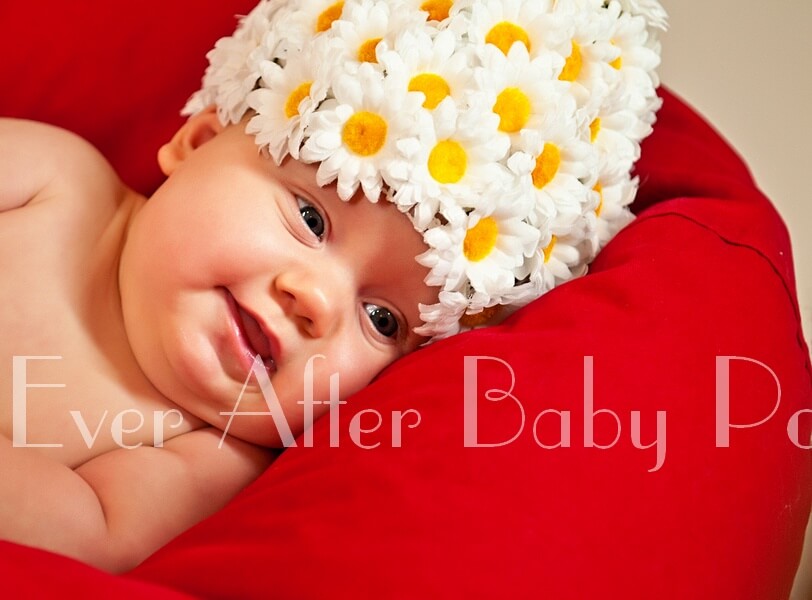 Reclining on a red pillow, this four month old baby is all decked out in her daisy hat.