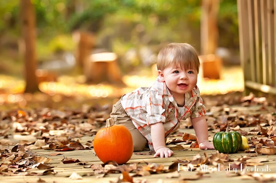 October is such an enjoyable time to be outdoors. The Johnson family came to our outdoor studio with their six month old son Roland. He is an active little boy crawling across the bridge, checking out the pumpkins and having fun with his daddy on the swing. Little Roland was even able to crawl up on our red sofa for a portrait standing up.