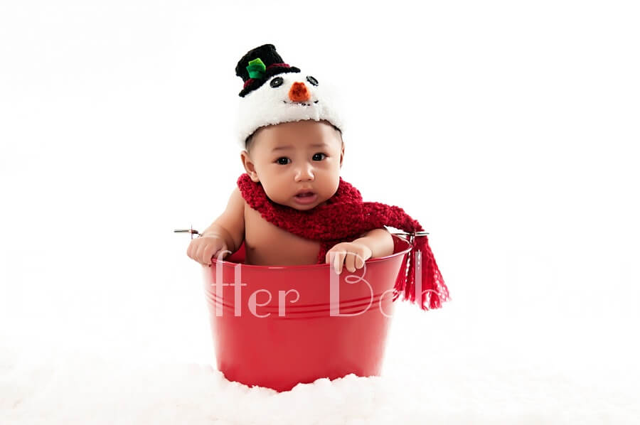 Ready for Frosty! This four month old is ready for winter with his snowman hat posing in a red bucket. (more…)