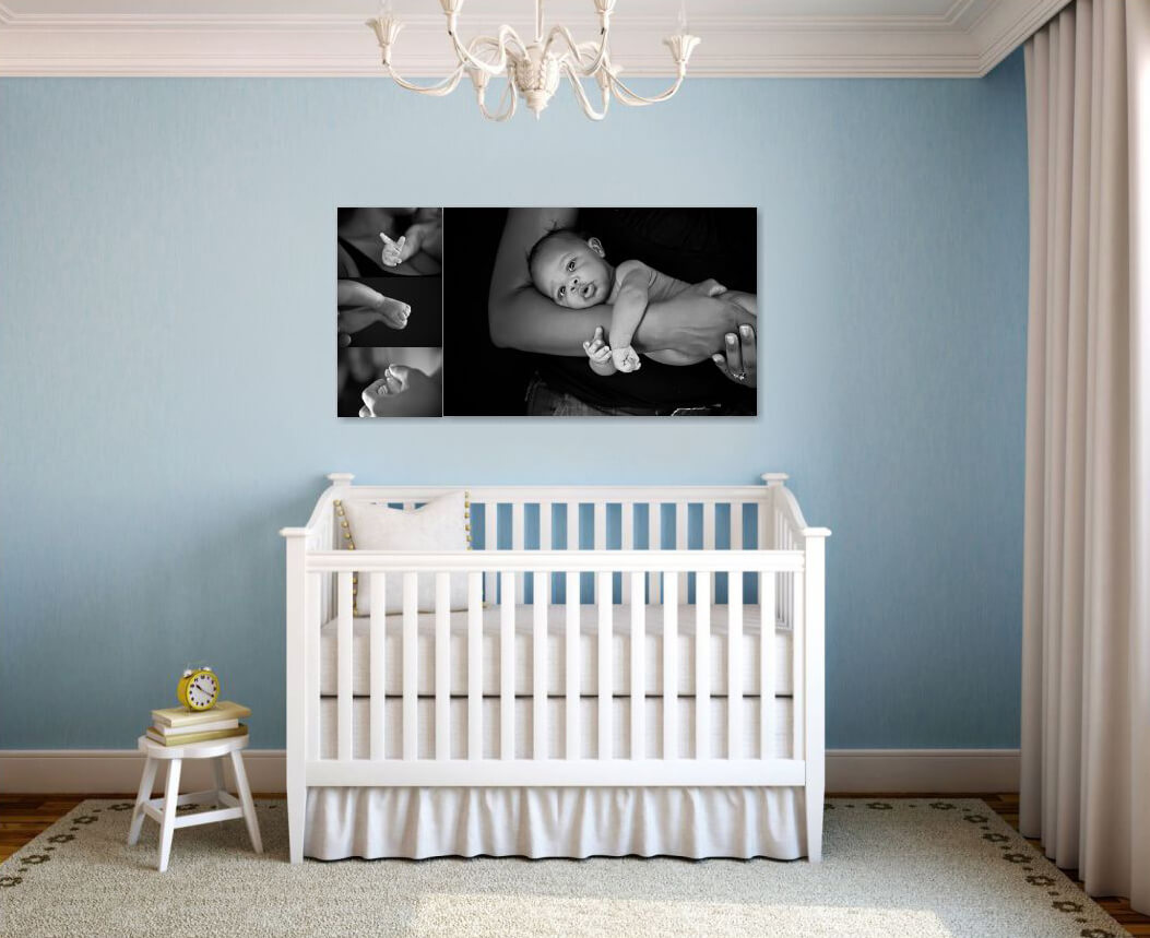 Can you say “bouncing baby boy”? Even at this age, little Tre was full of energy! Tiny toes and fingers, as well as a hand reaching out of the portrait towards you, make this black and white wall collection perfect for this blue nursery.