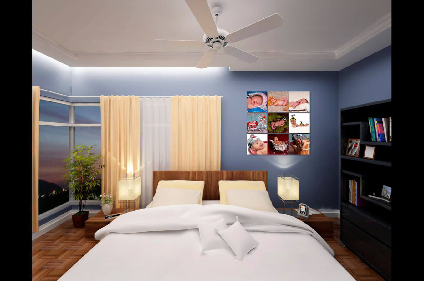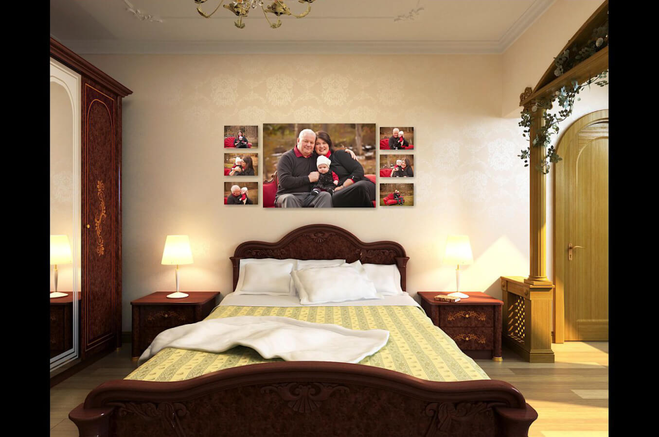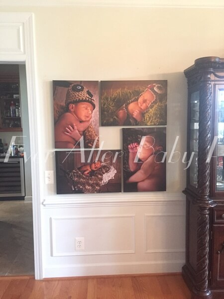 This collection of a cute baby boy tells his story with baby wall art from newborn to eight months old. Notice how this wall art changes the focus of the bedroom. There is a warmth and homey feeling now. These nine images make good use of the wall space without being too crowded. Sharing cherished memories of your baby as wall art is the piece de resistance in any home.