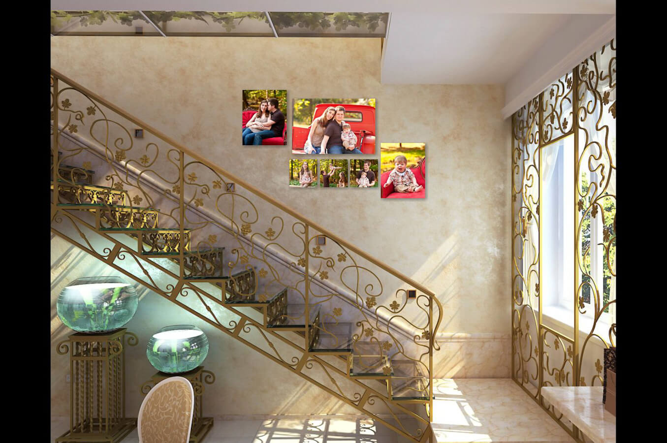 This baby girl wall collection brightens the wall at the top of the stairway. The portraits of Little Nadia with her family transforms this house into a home. The mixture of small and large images display this portrait session in a creative design. Wall images created as artwork capture the feelings of the family. Now is the time to think about a portrait session for your family so you can share the images during the holidays.
