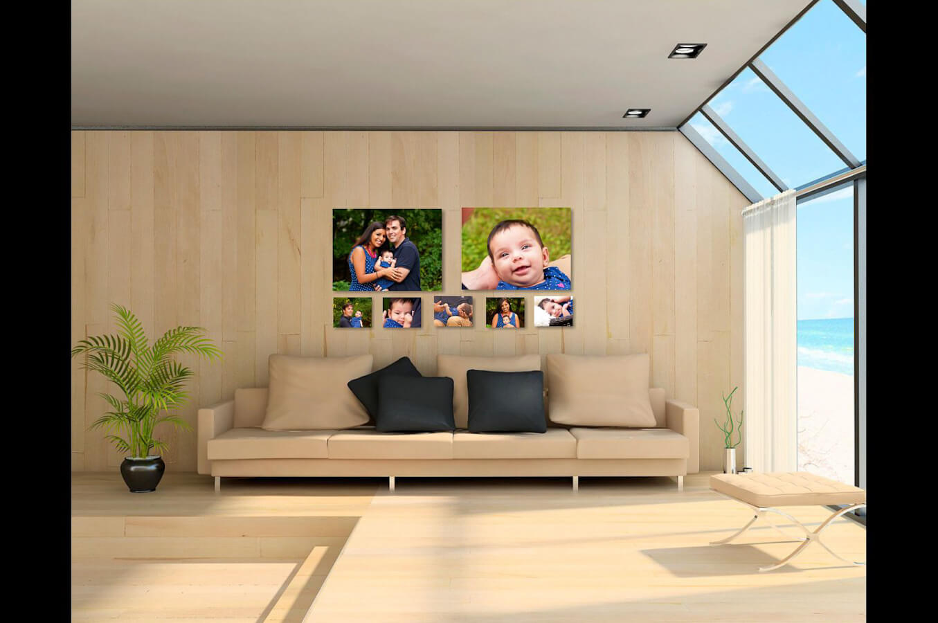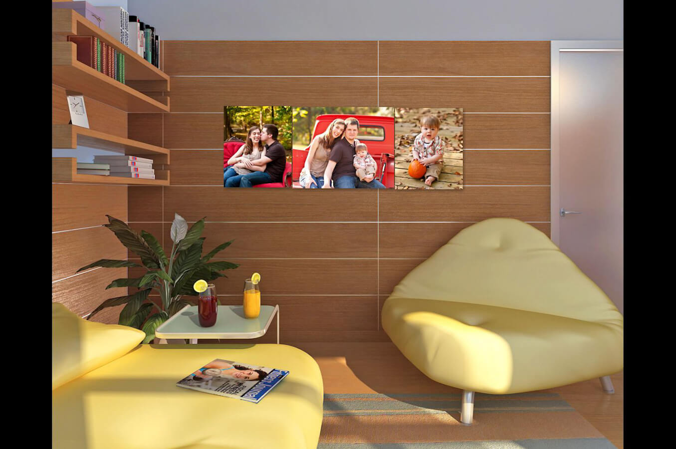 The candid wall collection features a young couple with their adorable baby boy. The family room wall images fits in perfectly with this casual comfortable furniture. The images pop out on the background of the wood paneling walls taking on a life of their own. The collection gives the look of a three part book coordinating with the books on the shelf.