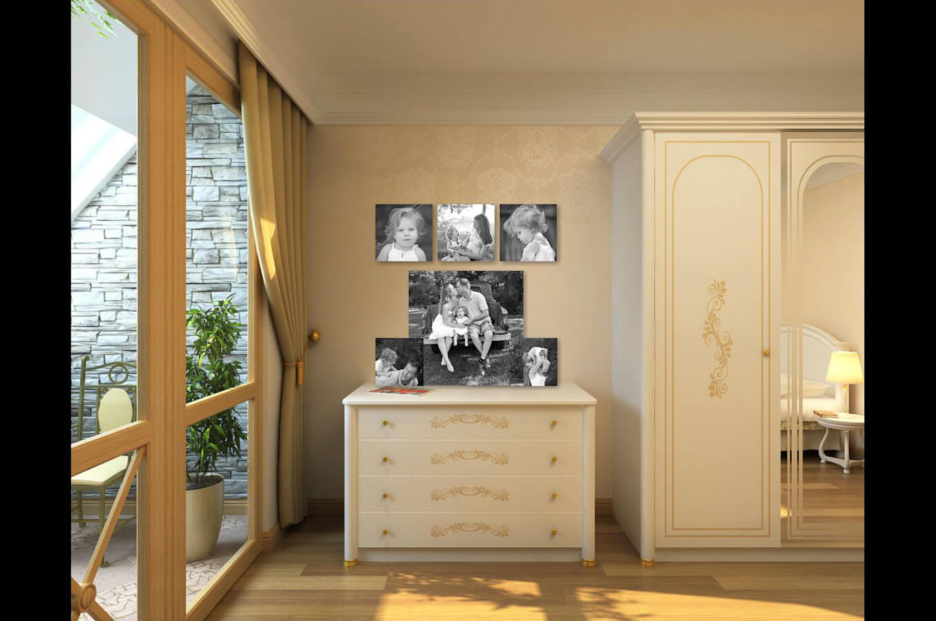 This wall collection transports us to another time in our life. The emotional and candid images are displayed in black and white wall art. It completes the room as it complements the antique decor in this bedroom. Family is the heart of this collection. This adorable one year old girl with her mother and father light up the room with their love and devotion to each other.