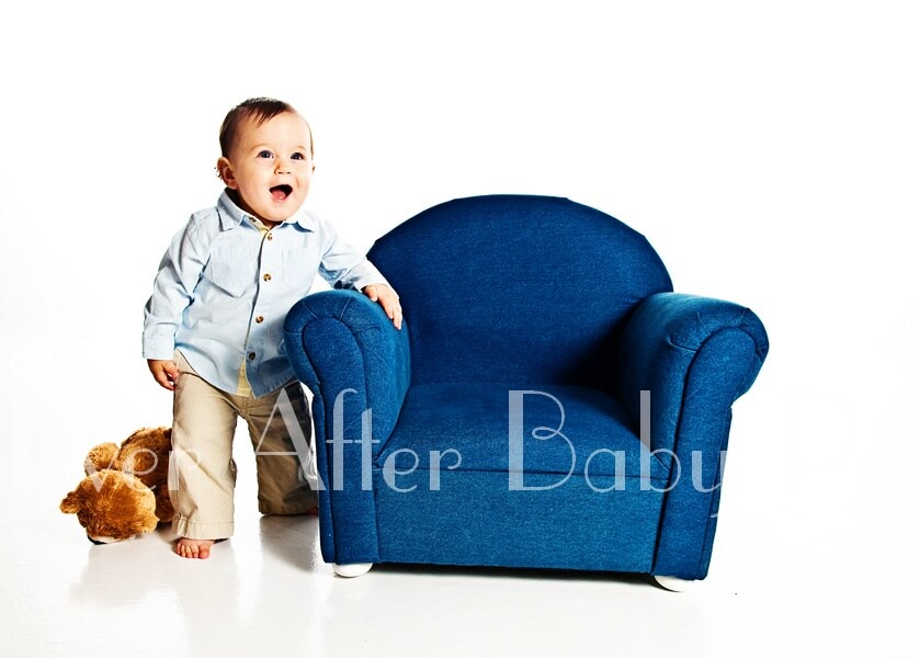 Big smiles for JD as he stands next to his favorite blue chair with his teddy bear in the background.