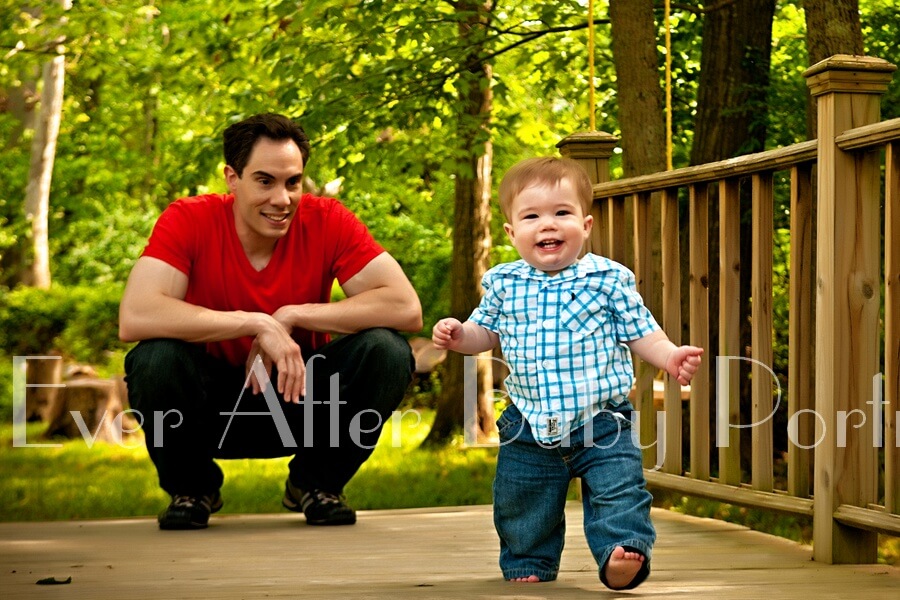 Little Gavin toddles across the bridge with his daddy in close supervision in this outdoor portrait.