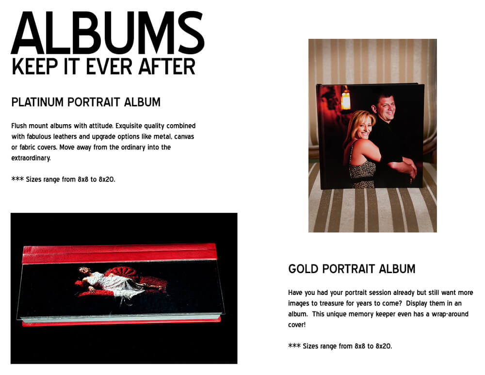 When you order one of our stunning albums, you will know that you will forever have your favorite images from your session to display in a place of prominence in your home for years to come. This album is custom-designed, finished with luxurious leathers and top quality printing. Let us custom design your album to tell your story!